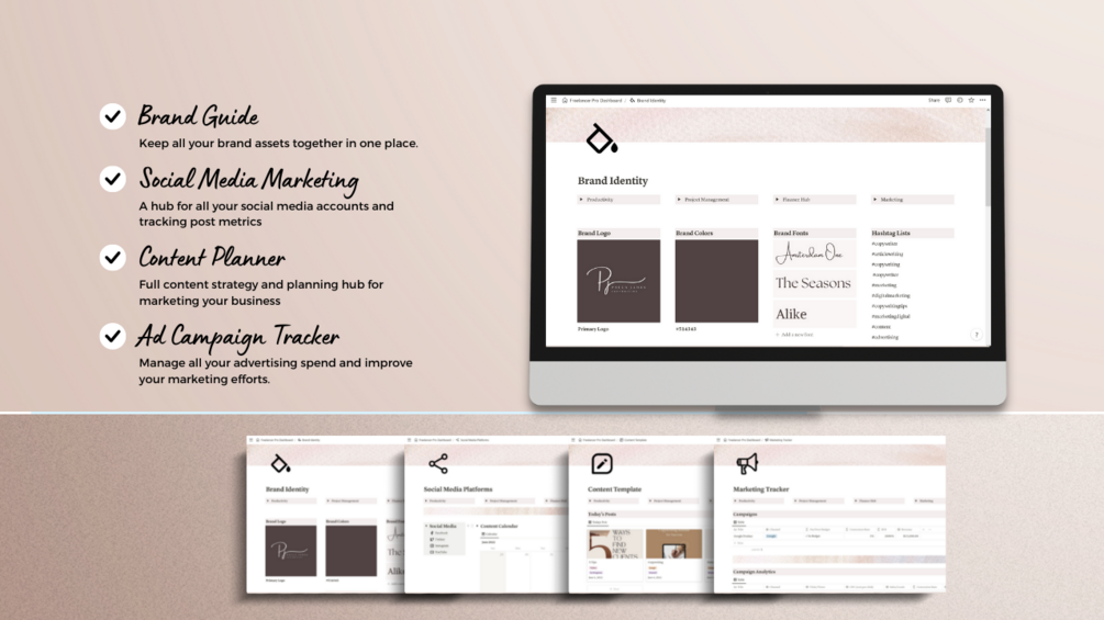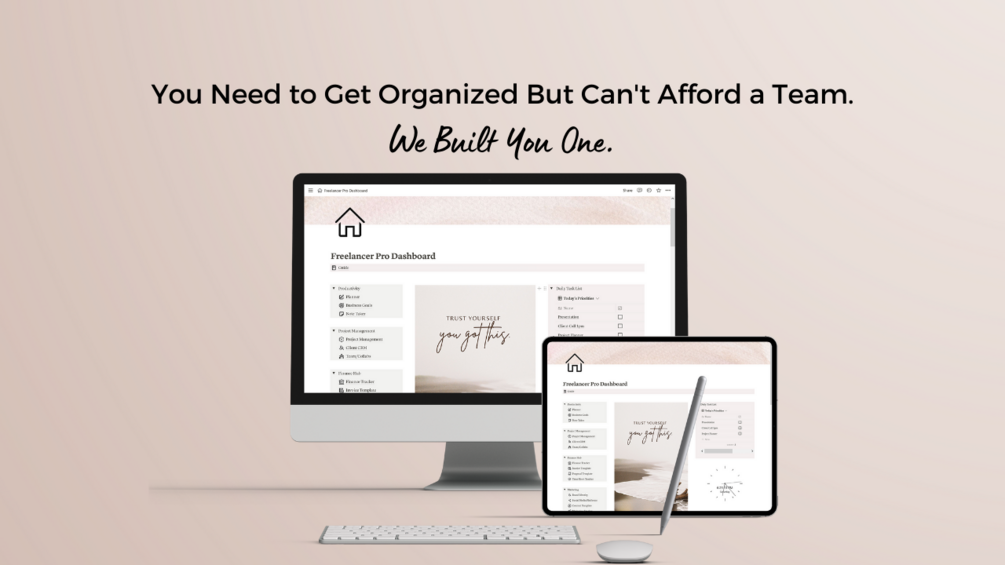 A complete freelance business Notion template that helps you organize your time, manage clients, track finances, marketing, content strategy and more!