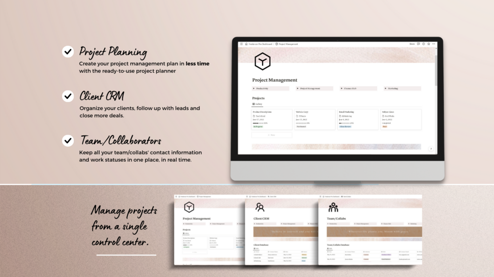 Forget about messy spreadsheets. Use this Aesthetic Notion Freelance Business Template to create and organize your entire freelance business from clients and projects to business finances and marketing.